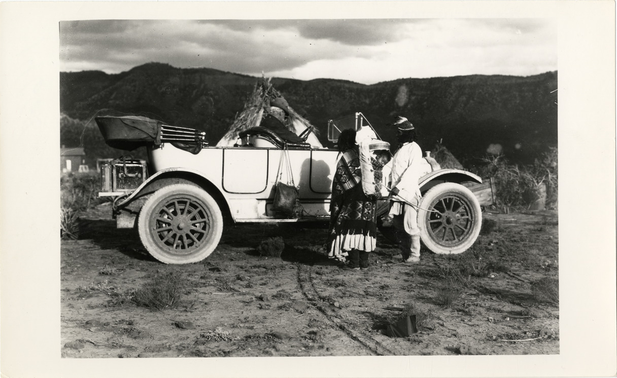 View of Apache Indian man, woman and child standing next to 1913 White car in New Mexico during a 1912 pathfinding tour from Denver, Colorado to Salt Lake City, Utah. Teepee in background. Handwritten on back: "1912 White trip to SW. White, 1913."