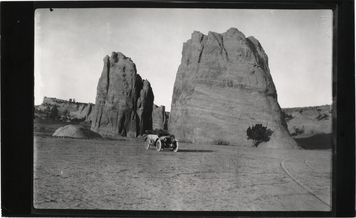 View of motorists in 1913 White car in front of rock formations during a 1912 pathfinding tour from Denver, Colorado to Salt Lake City, Utah. Handwritten on back: "1912 White trip west. White, 1913."