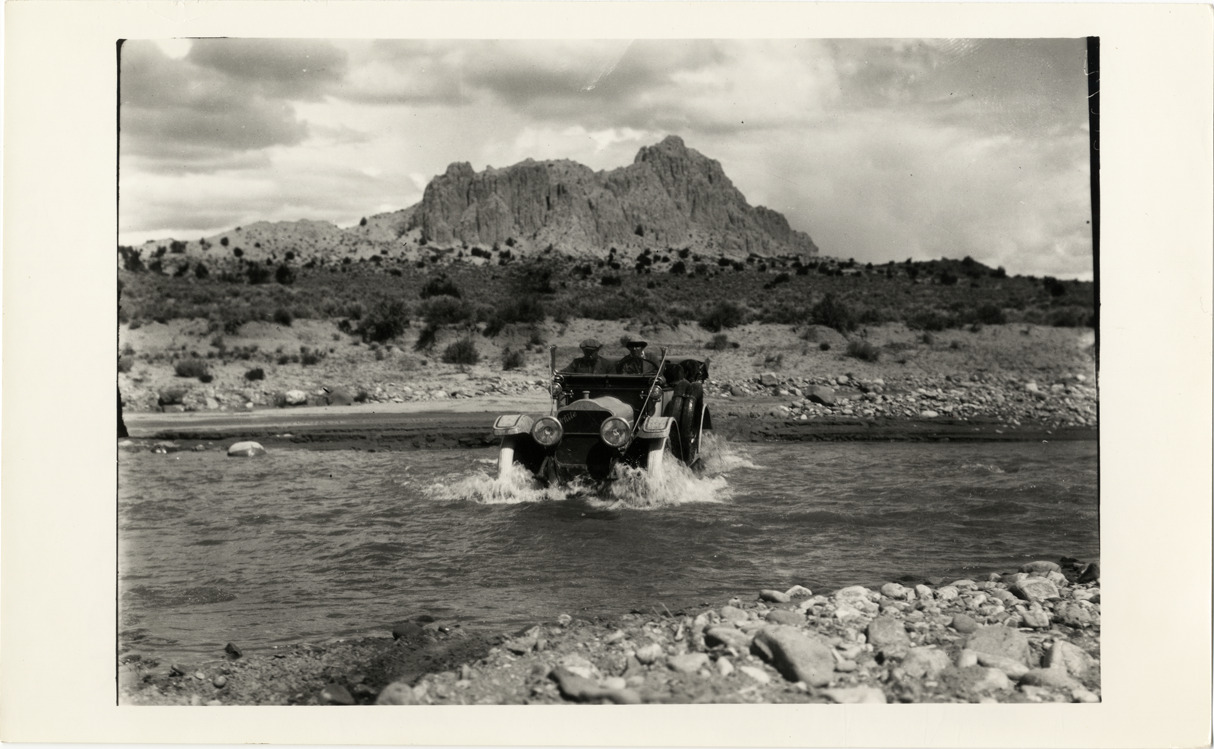 View of motorists in 1913 White car fording a river during a 1912 pathfinding tour from Denver, Colorado to Salt Lake City, Utah. Handwritten on back: "1912 White trip to SW. White, 1913."