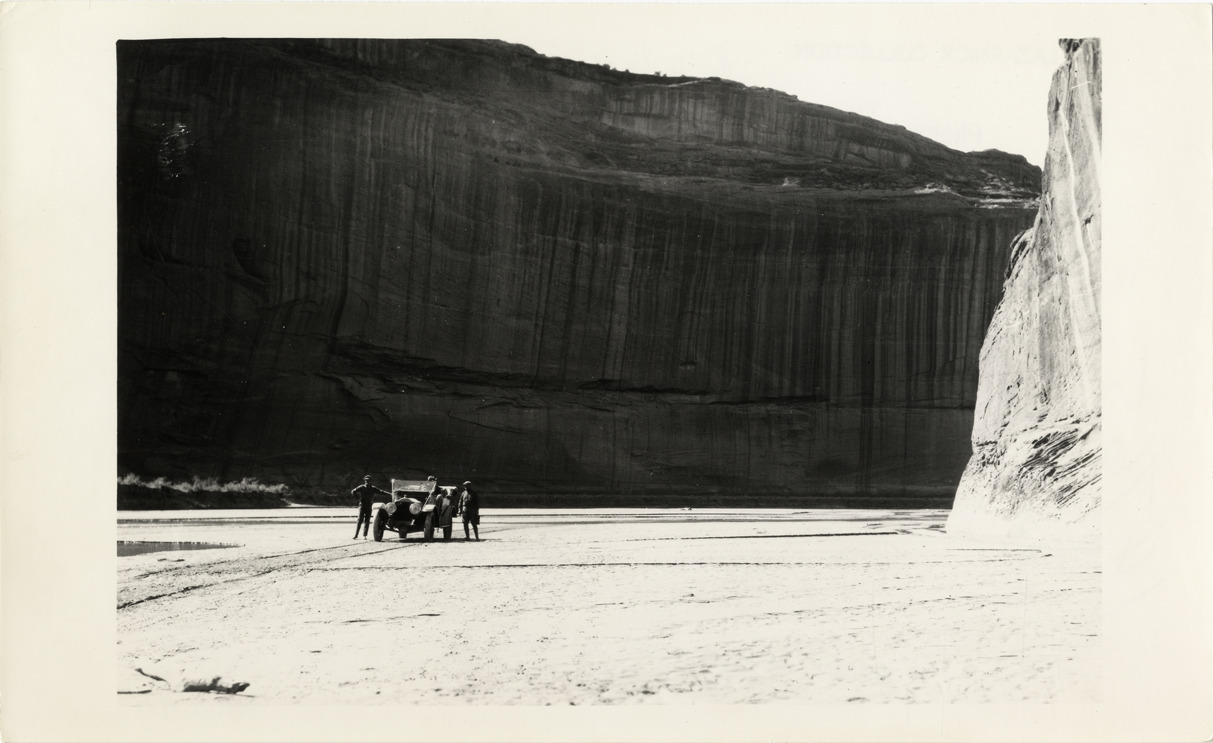 View of motorists in 1913 White car fording a river during a 1912 pathfinding tour from Denver, Colorado to Salt Lake City, Utah. Handwritten on back: "1912 White trip to SW. White, 1913."