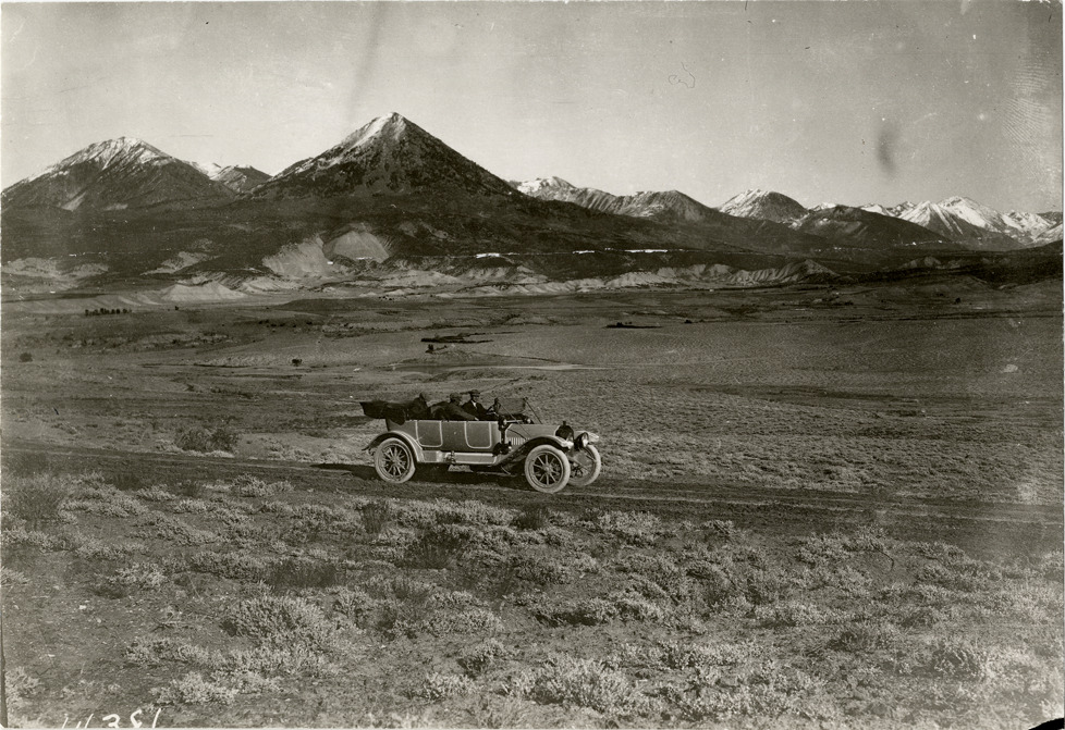 Motorists in 1913 White automobile traveling past mountain range, 1912 Denver to Salt Lake City pathfinding tour