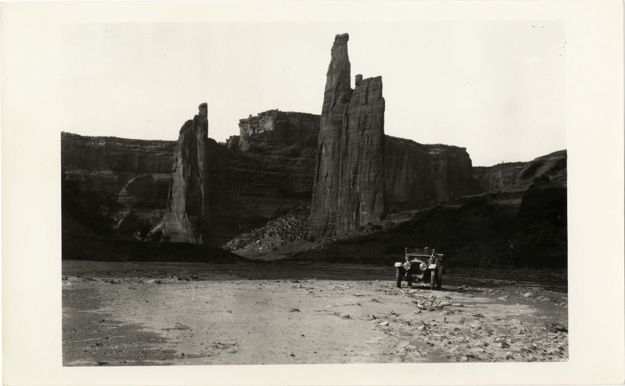 View of motorists in 1913 White car in front of rock formation during a 1912 pathfinding tour from Denver, Colorado to Salt Lake City, Utah. Handwritten on back: "1912 White trip to SW. White, 1913."