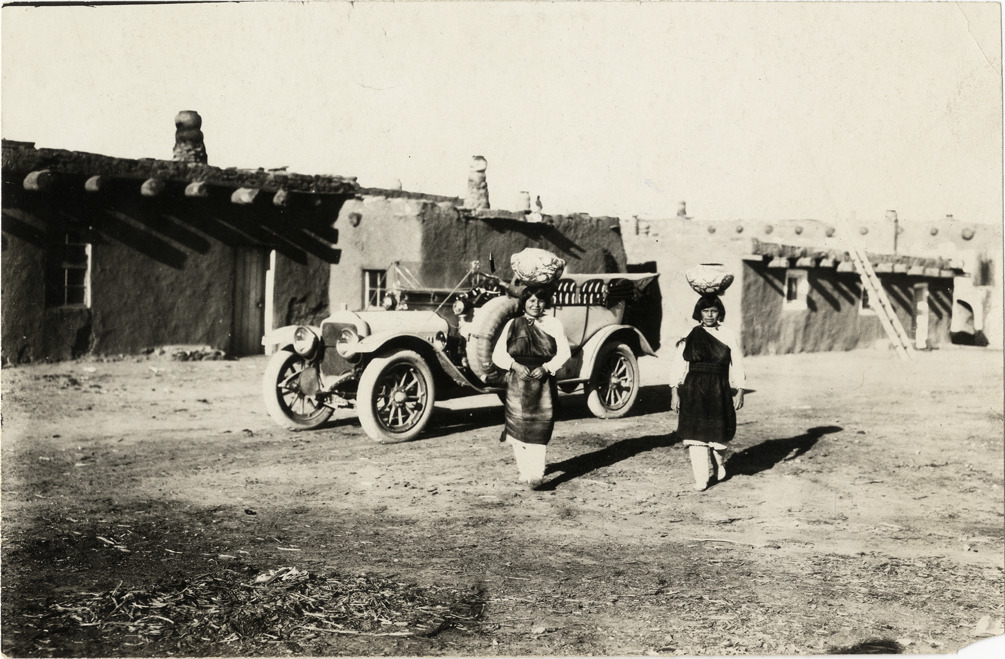 View of two American Indian girls, balancing vessels on their heads, posing in front of 1913 White car during a 1912 pathfinding tour from Denver, Colorado to Salt Lake City, Utah. Pueblos in background. Stamped on back: "Photo by N. Lazarnick." Handwritten on back: "White, 1913."
