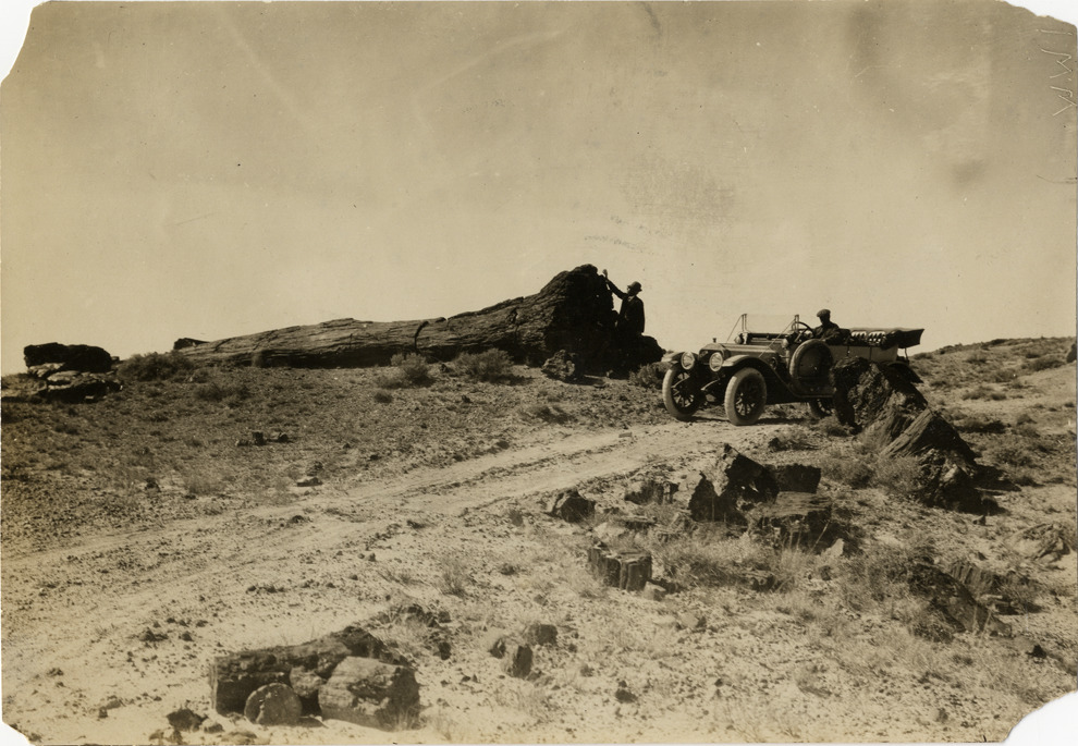 View of motorists with 1913 White car looking at a petrified log during a 1912 pathfinding tour from Denver, Colorado to Salt Lake City, Utah. Handwritten on back: "White, 1913."