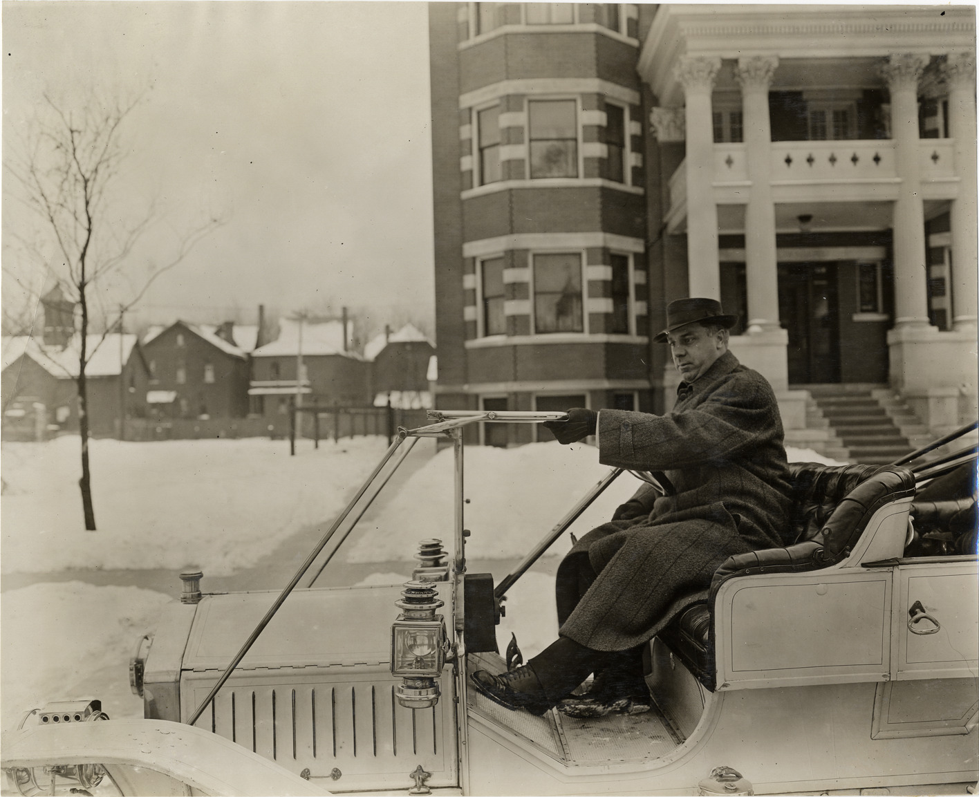 Close-up view of driver Earl Jackson in 1910 Buick car adjusting the windshield. Apartment building and snow-covered ground in background. Handwritten on back: "Earl Jackson, Buick, 1910. Windshields, 1910."
