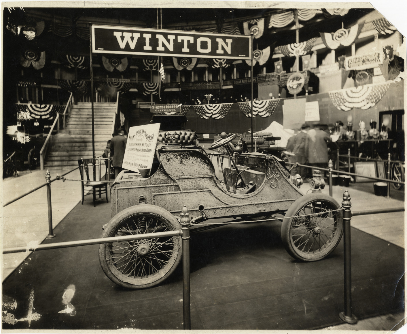 View of Winton American Challenger car on exhibit during the 1900 New York Auto Show held at Madison Square Garden in New York. Sign on car reads: "Winton's American Challenger driven by Alexander Winton, Nov. 1st to 4th, Cleveland to Madison Square Garden, American long distance record." "Winton" sign in background. Stamped on back: "N. Lazarnick, commercial photographers, makers of industrial motion pictures, 246 W. 42nd St., N.Y. Tel. Bryant 0594" and "Photo by N. Lazarnick" and "Only the exclusive reproduction rights from this illustration are sold by Lazarnick." Handwritten on back: "1900 drove from Cleveland to NY for show, longest drive at time. Winton at N.Y. Auto Show. Winton, 1900."