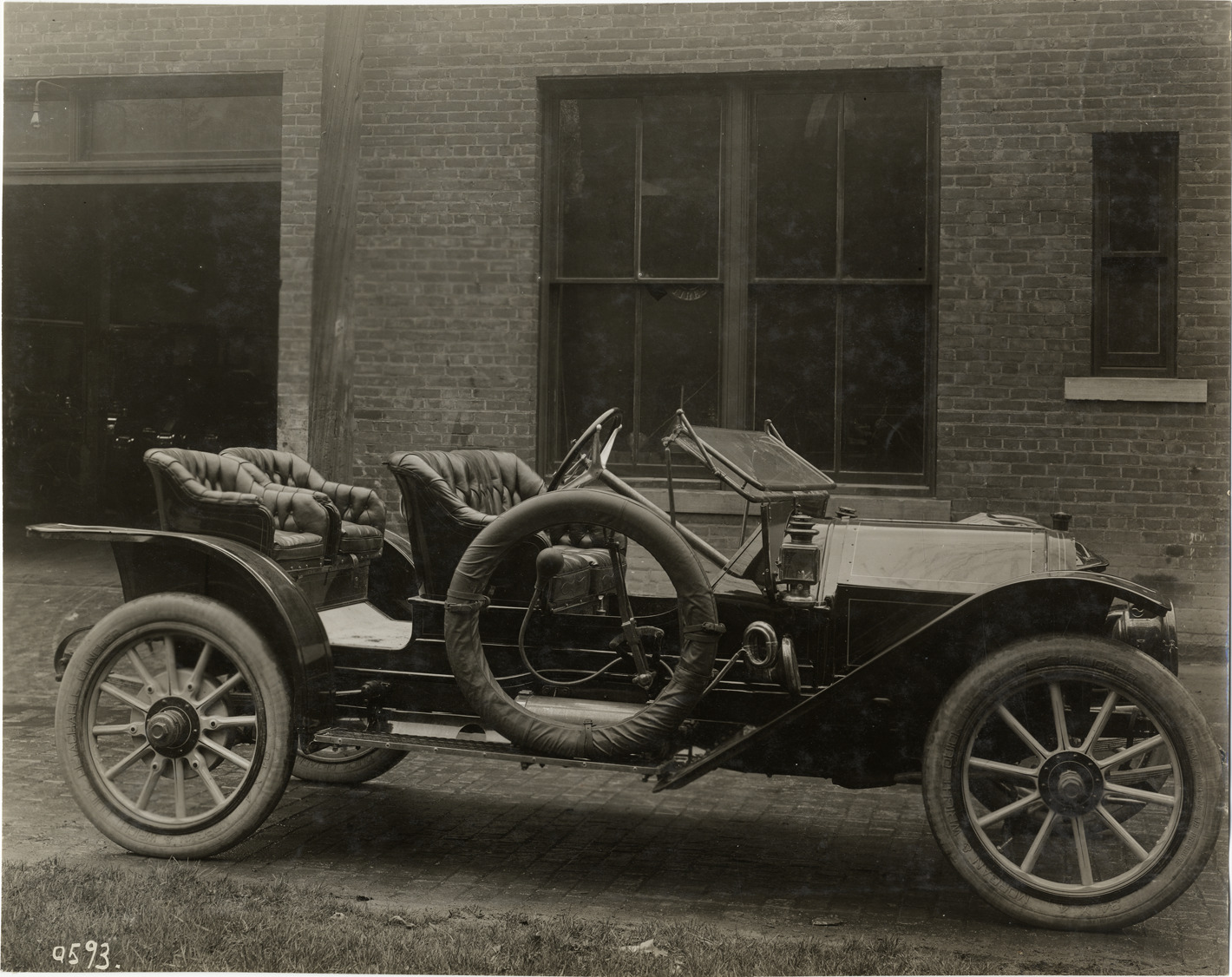 View of damaged 1910 Chalmers-Detroit car with broken windshield, owned by Joe Warren. Brick building in background. Stamped on back: "Spooner & Wells, Inc., photographers, telephone North 1745. 1231 Woodward Ave., Detroit, Mich. Detroit, 1231 Woodward, New York, 1931 Broadway." Handwritten on back: "Wrecks--Chalmers-Detroit, 1910."