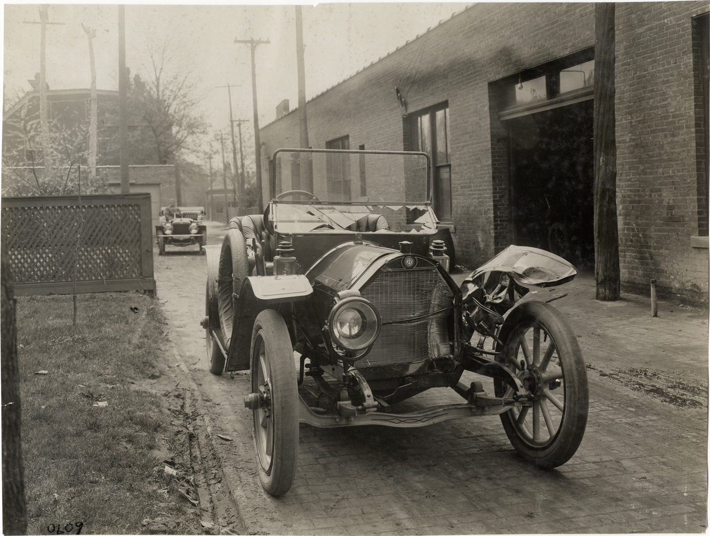 Favorite this☆ Damaged 1910 Chalmers-Detroit automobile Description: Front view of damaged 1910 Chalmers-Detroit car with broken windshield and crumpled fender, owned by Joe Warren. Brick building and alley in background. Handwritten on back: "Wrecks--Chalmers-Detroit, 1910." Details Resource ID: na031772 Subject: Automobiles Chalmers-Detroit Motor Company Automobiles--Windows and windshields Automobiles--Collision damage Photographic prints Date Issued: 1910 Format: 1 photographic print ; 7.25 x 9.75 in. Member of: National Automotive History Collection Lazarnick Collection Filing Location: Wrecks--Chalmers-Detroit, 1910 Rights: Physical rights are retained by DPL. Copyright is retained in accordance with U.S. copyright laws.