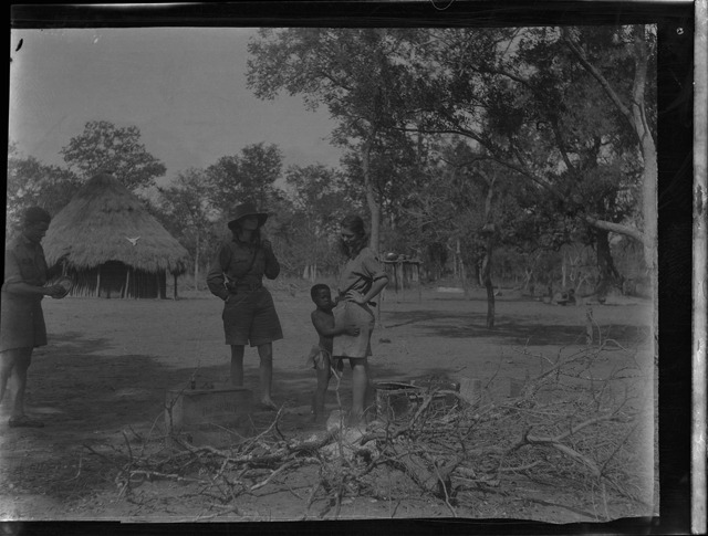 View of Meg Hall and members of Wanderwell expedition with young boy at camp in Mozambique. Dwelling with thatched roof in background. Handwritten on sleeve: "Mozambique, Shangaan, in camp with children."