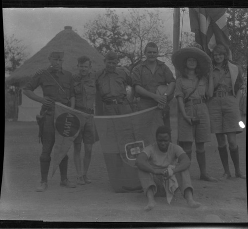 View of Aloha Baker, Meg Hall, Eric Owen and members of Wanderwell expedition holding flags and posing with man in Mozambique. Dwelling with thatched roof in background. Handwritten on sleeve: "Mozambique, border of So. Africa, crowd of mine laborers [sic]."