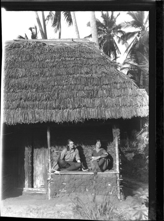 View of Aloha Baker and Meg Hall posing on porch of dwelling with thatched roof in Mozambique. Handwritten on sleeve: "Mozambique, accommodations by the Sabi River, A.W. and sister Meg."