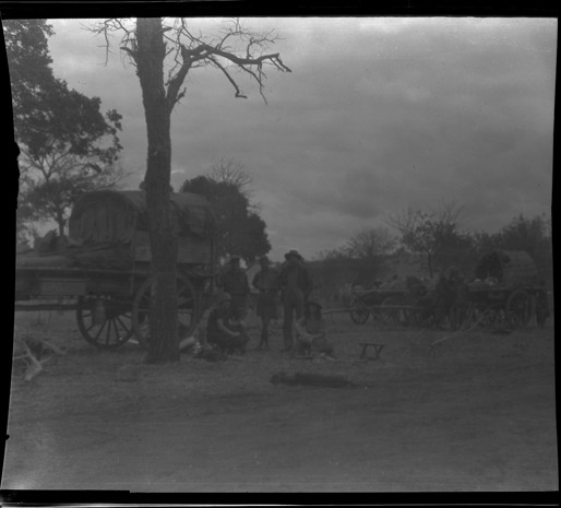 View of members of Wanderwell expedition in Transvaal, South Africa; wagons in background. Handwritten on sleeve: "Transvaal, So. Africa, the last wagons before Mozambique."