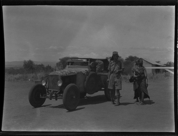 View of Eric Owen and Maasai women posing next to Wanderwell car. Member of Wanderwell expedition climbs into car. Handwritten on sleeve: "Masai (Kenya) women in leather wrap, Owen a la legionnaire, 1st explorer being explored."