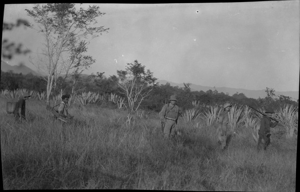 View of Aloha Baker and two members of Wanderwell expedition walking through grassland and carrying rifles. Two unidentified men with gear follow the group. Handwritten on sleeve: "Mozambique, East Africa, 1926/27."