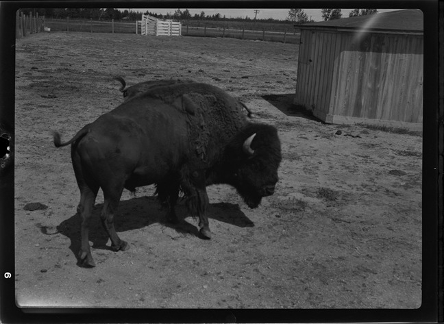 View of buffalo in pen; wooden-frame shed in background.