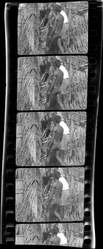 View of Aloha Baker and Bororo Indian man entering thatched dwelling. Handwritten on sleeve: "Brazil, 1930/31, A.W. being led by native Bororo thru thatched 'wall' into dance area for ceremonial estatic [sic] jogging."
