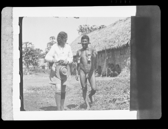 Favorite this☆ Aloha Baker and Bororo chief Description: View of Aloha Baker walking with Bororo chief; thatched dwelling in background. Handwritten on sleeve: "Brazil, Bororos. Cap [sic] walking with Bororo chief (with feathers) walking across compount [sic]." Details Resource ID: na032050 Subject: Bororo Indians--Brazil--Mato Grosso (State) Baker, Aloha W., 1908-1996 Thatched buildings--Brazil--Mato Grosso (State) Baker, Aloha W., 1908-1996--Archives Photography--Negatives Date Issued: 1930 to 1931 Format: 1 negative ; 2.75 x 3.5 in. Member of: National Automotive History Collection Filing Location: MS33/Aloha Baker collection, Box 7, Folder 9, America: South, Negative Book, Brazil (Bororo), 1930-31 Negative Number: SAM-049 Rights: Physical rights are retained by DPL. Copyright is retained in accordance with U.S. copyright laws.
