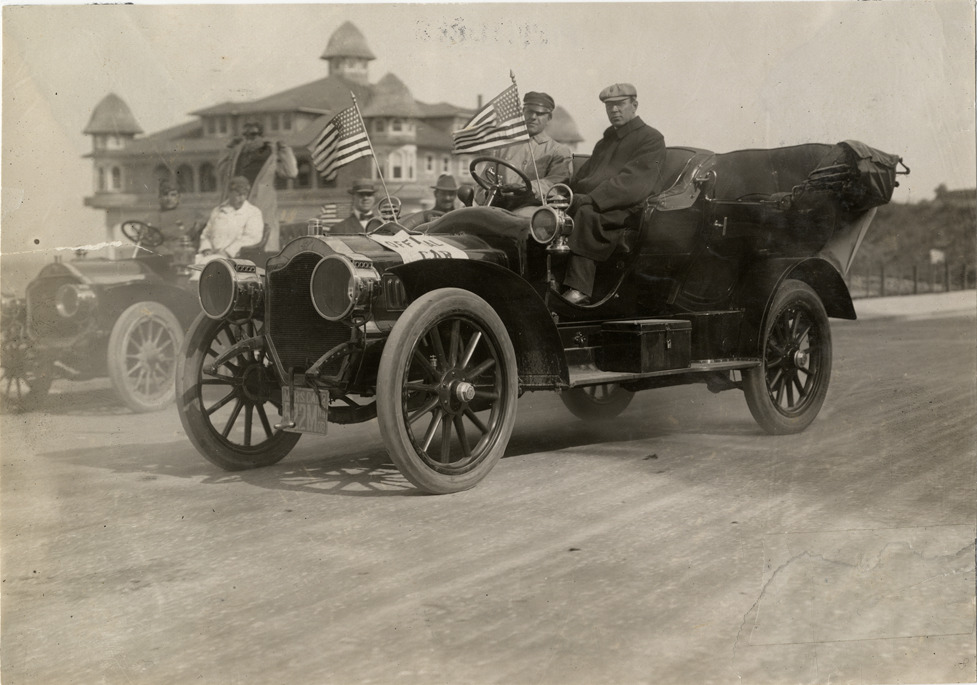 View of motorists posing in Thomas official car. Two American flags and "Official car" sign are displayed on car. Stamped on back: "Spooner & Wells, Inc., photographers, telephones 3472-3473 Columbus, 1931 Broadway, New York." Handwritten on back: "Thomas, ca 1907-8."