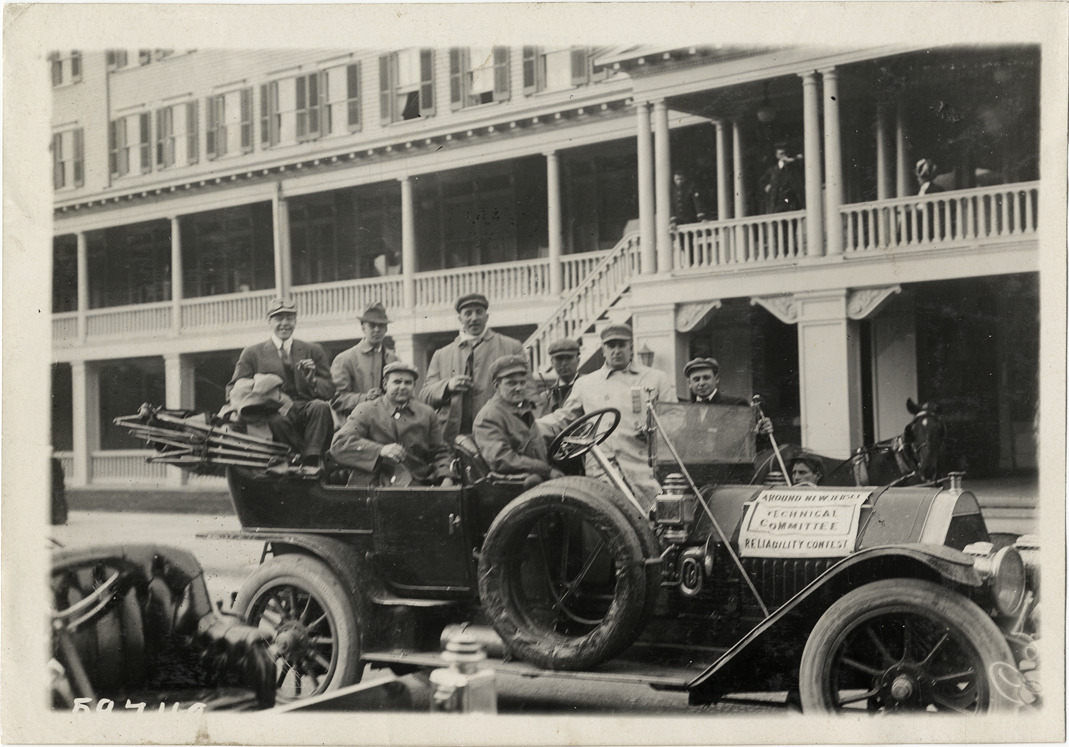 View of members of the Technical Committee posing in Thomas car during the 1910 New Jersey Reliability Run. Hotel in background; sign on car reads: "Technical Committee, Around New Jersey Reliability Contest." The endurance run, sponsored by the Motor Contest Association, covered a route from New York to Atlantic City and return. Stamped on back: "Spooner & Wells, Inc., photographers, telephones 3472-3473 Columbus, 1931 Broadway, New York." Handwritten on back: "Thomas, 1910."