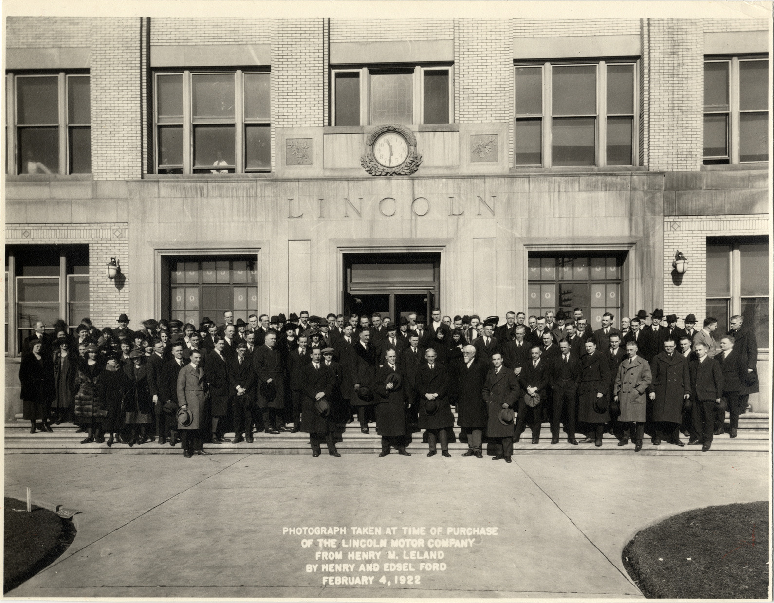 Group portrait of Henry M. Leland, Wilfred Leland, Henry Ford, Edsel Ford and group of men and women in front of the Lincoln Motor Company, taken at the time of purchase from Leland to Henry and Edsel Ford. Printed on front: "Photograph taken at time of purchase of the Lincoln Motor Company from Henry M. Leland by Henry and Edsel Ford, February 4, 1922. Label on back: "Lincoln Motor Co., 1922."