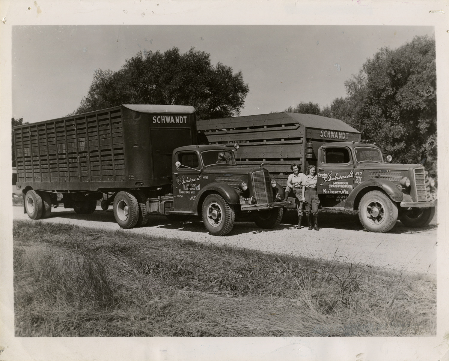 View of two women truck drivers posing with two trucks, no. 2 and no. 6, owned by Schwandt Livestock Transportation. Painted on truck cabs: "Schwandt Livestock Transportation. Markesan, Wis."