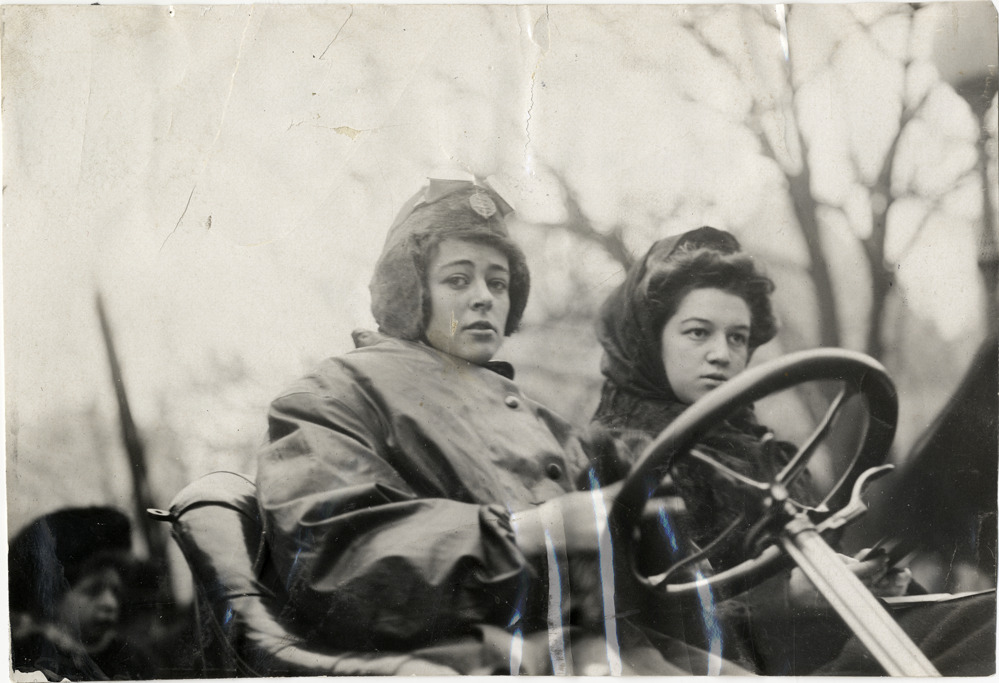 Close-up view of Alice Ramsey and passenger posing in car during the 1909 New York to Philadelphia Run sponsored by the Women's Motoring Club. Stamped on back: "Spooner & Wells, Inc., photographers, telephones 3472-3473 Columbus, 1931 Broadway, New York." Handwritten on back: "Ladies' run, NY-Phila., Jan. 1909. Biography--Ramsey, Alice."