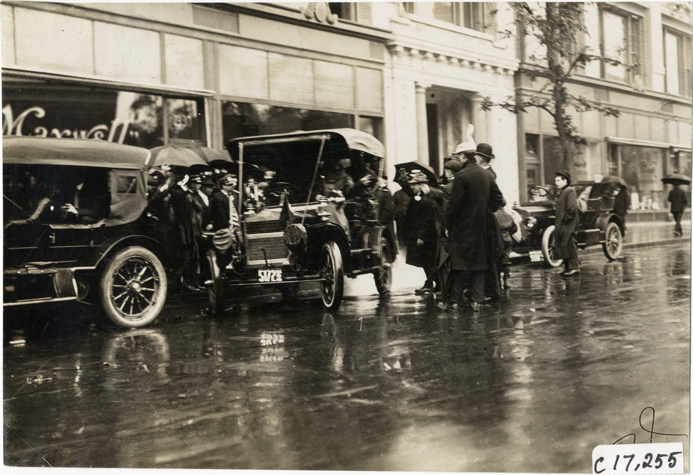 View of onlookers surrounding Alice Ramsey and three women passengers in Maxwell car parked on city street during her 1909 cross-country tour. Stamped on back: "Spooner & Wells, Inc., photographers, telephones 3472-3473 Columbus, 1931 Broadway, New York." Handwritten on back: "Alice H. Ramsey Maxwell tour, 1909. Biography--Ramsey, Alice."