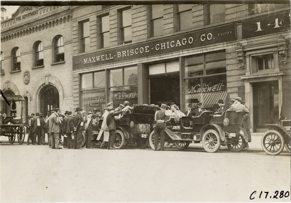 Distant view of Alice Ramsey and passengers in Maxwell car parked on city street at Chicago, Illinois during her 1909 cross-country tour. Another car is parked behind Maxwell car; onlookers surround cars. Maxwell-Briscoe-Chicago Co. building and Chicago Fire Department fire station in background. Stamped on back: "Spooner & Wells, Inc., photographers, telephones 3472-3473 Columbus, 1931 Broadway, New York." Handwritten on back: "Alice H. Ramsey Maxwell tour, 1909. Biography--Ramsey, Alice."