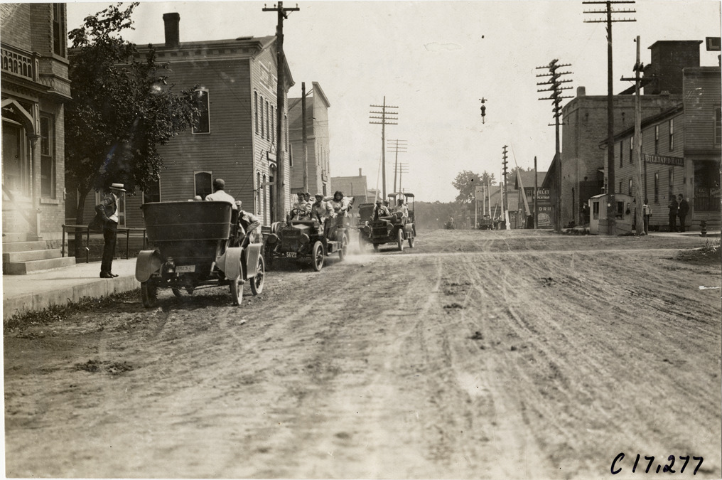 View of Alice Ramsey and three women passengers in Maxwell car in front of brick building during her 1909 cross-country tour. Two cars, facing in opposite directions, are parked on both sides of Maxwell car; wooden-frame building in background. Stamped on back: "Spooner & Wells, Inc., photographers, telephones 3472-3473 Columbus, 1931 Broadway, New York." Handwritten on back: "Alice H. Ramsey tour, 1909. Biography--Ramsey, Alice."