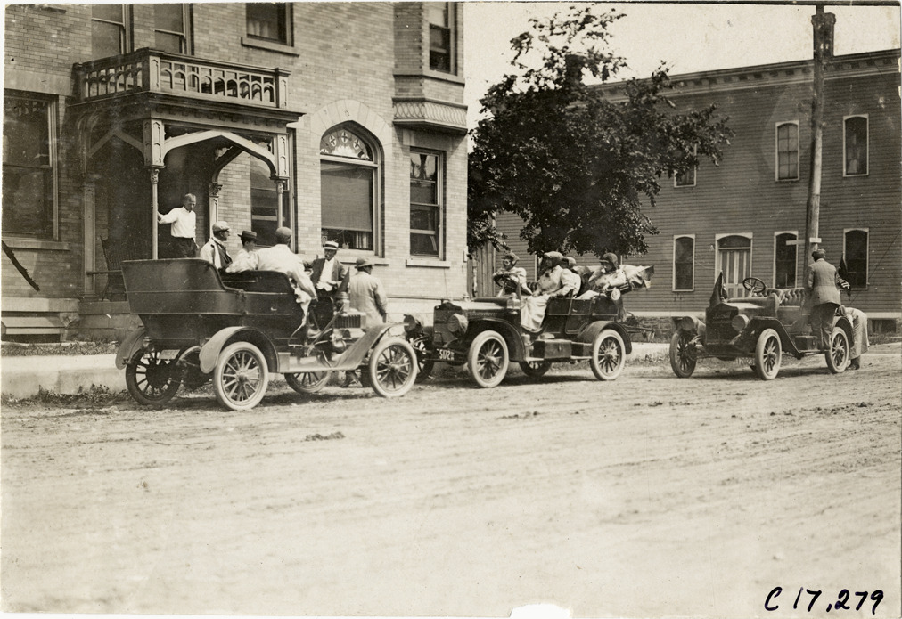 View of Alice Ramsey and three women passengers in Maxwell car in front of brick building during her 1909 cross-country tour. Two cars, facing in opposite directions, are parked on both sides of Maxwell car; wooden-frame building in background. Stamped on back: "Spooner & Wells, Inc., photographers, telephones 3472-3473 Columbus, 1931 Broadway, New York." Handwritten on back: "Alice H. Ramsey tour, 1909. Biography--Ramsey, Alice."