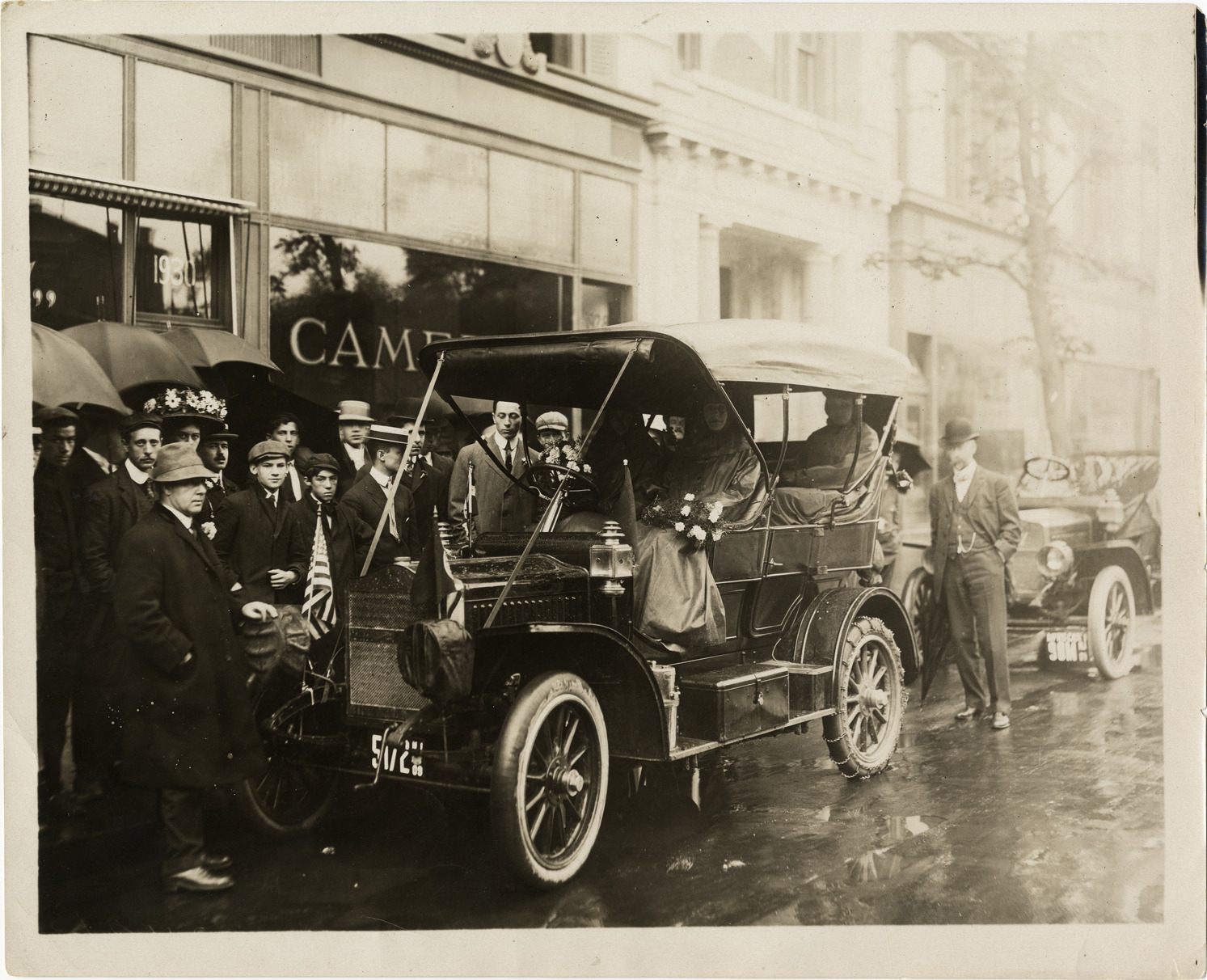 View of Alice Ramsey posing with three women passengers in Maxwell car during her 1909 cross-country tour. Ramsey and passenger hold bouquets of flowers; onlookers stand on sidewalk in background. Stamped on back: "Photo by Spooner & Wells, Inc. 1931 Broadway, N.Y." Typed on back: "Alice H. Ramsey tour, 1909. Automobile: Maxwell, 1909." Handwritten on back: "Biography--Ramsey, Alice."