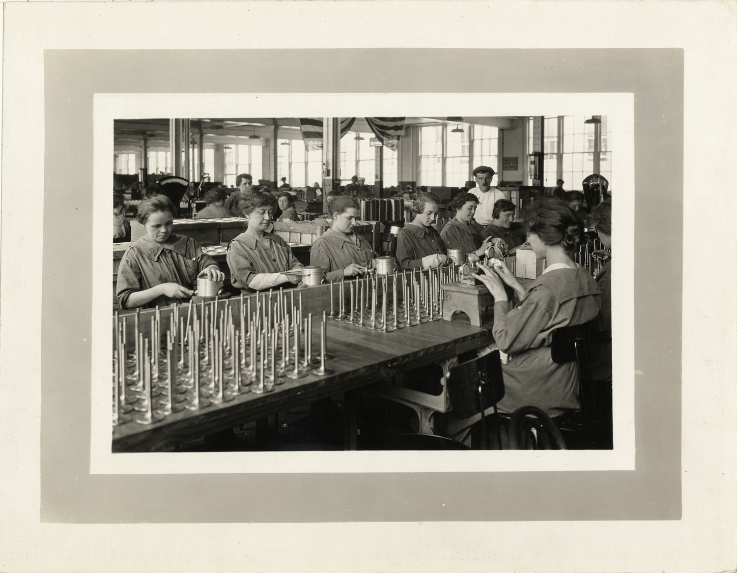 View of women factory workers assembling Liberty automobile engines at Lincoln Motor Company factory. Handwritten on back: "Photographs--Lincoln--Factory, interior--Liberty motors, 1917-1919."