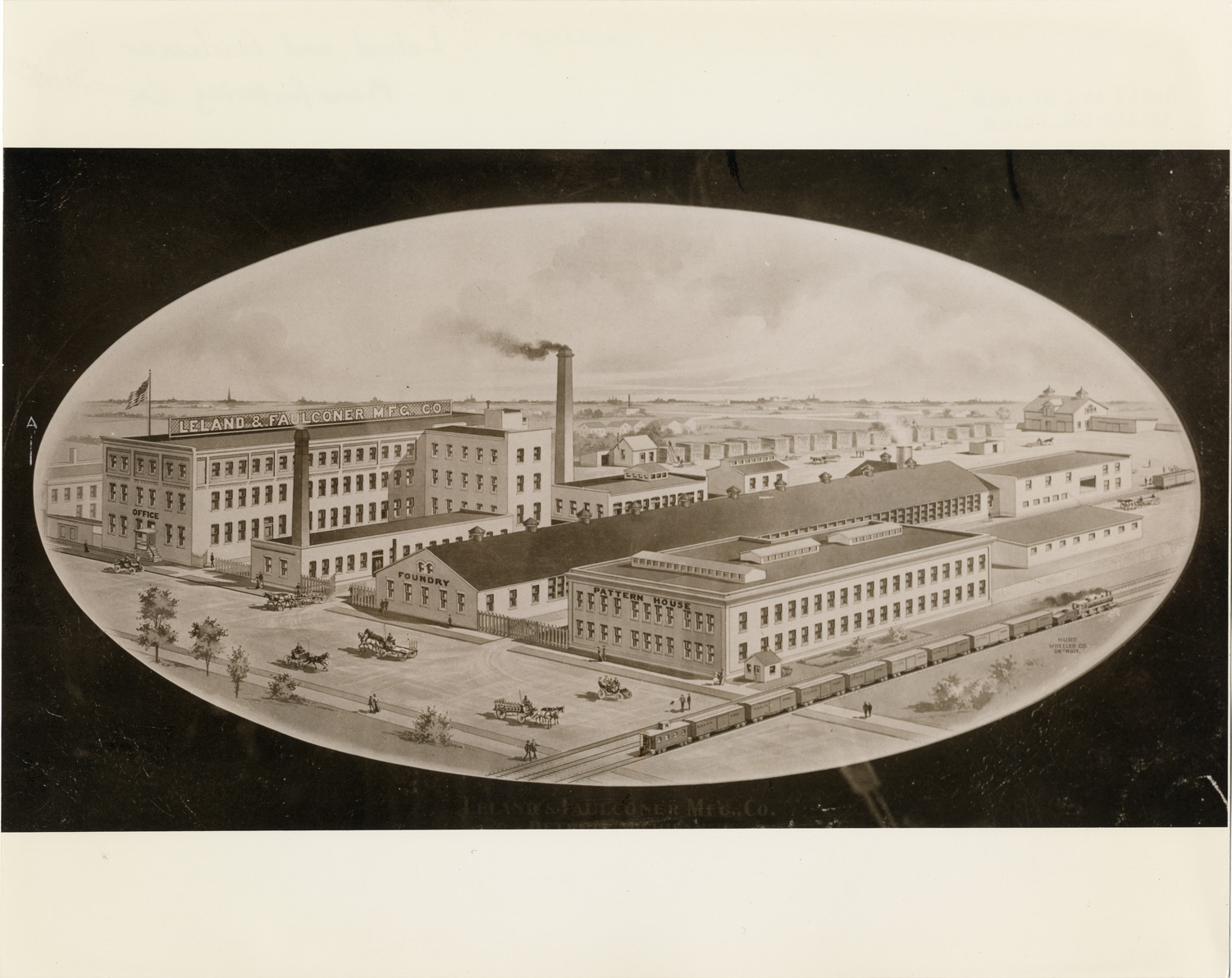 Artist's depiction of the Leland and Faulconer Manufacturing Company factory, showing office building, foundry and pattern house. Printed on front: "Leland & Faulconer Mfg. Co., Detroit, Mich. Hurd Wheeler Co., Detroit." Handwritten on back: "Photographs--Leland and Faulconer Manufacturing Co.--Factory."