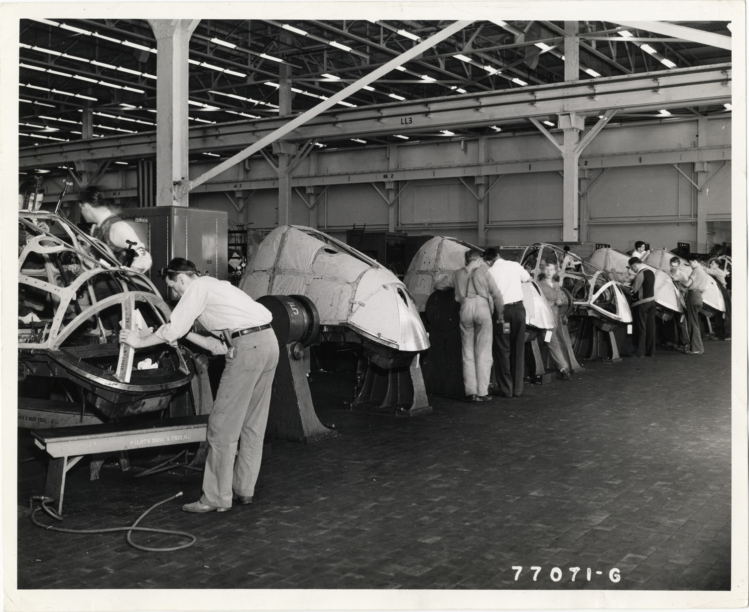 View of men assembling bombardiers' and pilots' enclosures for bomber plane at the Willow Run assembly plant. Label on back: "Several Ford improvements were made on production methods in the subassembly of the pilots' and bombardiers' enclosures at Willow Run. The fixtures themselves are designed by company engineers. Underframes are made on draw dies in large sections, providing additional strength and fewer operations. From Ford news bureau. John W. Thompson, director. Administration Building, Dearborn, Michigan." Handwritten on back: "Aircraft--Bombers (Parts & assembly)."