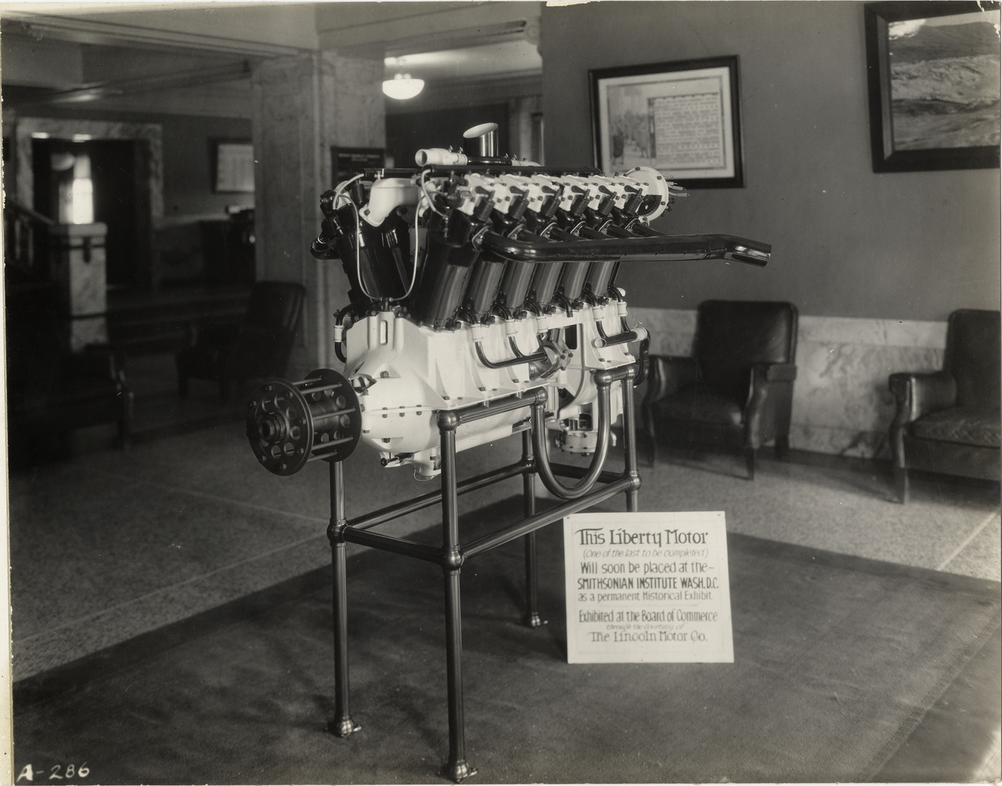 View of Liberty automobile engine at the Lincoln Motor Company. Sign in front of motor reads: "This Liberty motor (one of the last to be completed). Will soon be placed at the Smithsonian Institute, Wash., D.C. as a permanent historical exhibit. Exhibited at the Board of Commerce through the courtesy of the Lincoln Motor Co." Handwritten on back: "Photographs--Lincoln--Liberty motor."