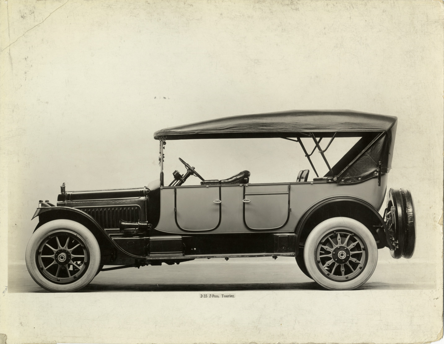 View of a 1917 Model 2-35 Packard 7-passenger touring car. Printed on front: "2-35 7-pass. touring" printed on front. Handwritten on back: "1917 Packard 2-35, Second Series Twin Six, 12 cy., 88 b.h.p., 135: whb., touring 7-p. (Body-type #154). Fitted with side-folding auxiliary 'armchair' seats."