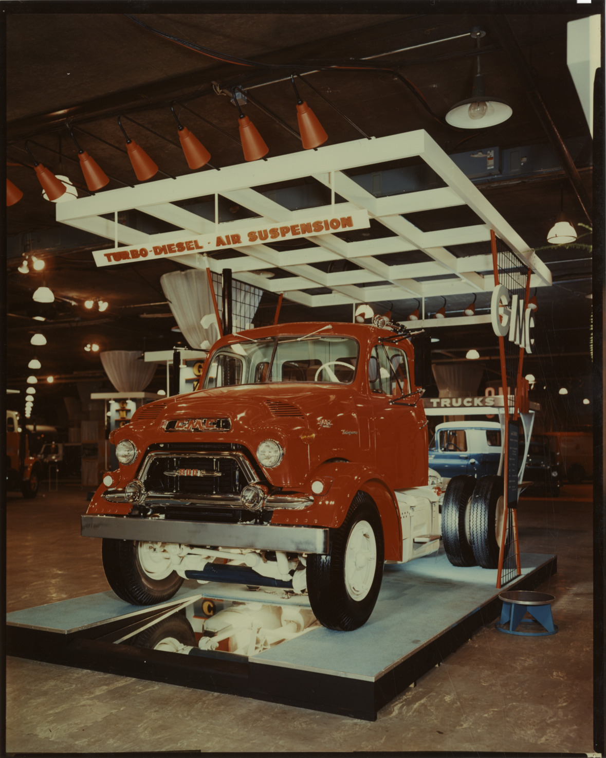 View of 1954 GMC truck displayed at a trade show. Sign overhead reads: "Turbo-diesel, air suspension." Mirror placed under front end of truck shows undercarriage.