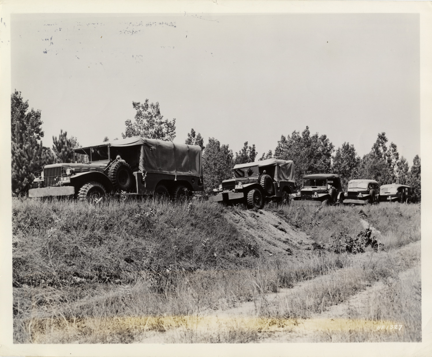 View of several Dodge Army military trucks at Chrysler Army Truck Proving Ground. Label on back: "At the Chrysler Army Truck Proving Ground five different types of Dodge Army trucks started out for a series of tests to see whether they can take the kind of treatment which they may receive under actual battle conditions. Above are shown from left to right: a 6 x 6 Dodge troop transport; a 4 x 4 Dodge weapon carrier with winch mounted in front; a 4 x 4 Dodge command car; a 4 x 4 Dodge carry-all; and a 4 x 4 Dodge ambulance. These trucks will be made to go through virgin woods, up and down steep inclines up to and exceeding 60 [degrees], through water at different speeds, and in deep sand and mud. (AT-1327)."