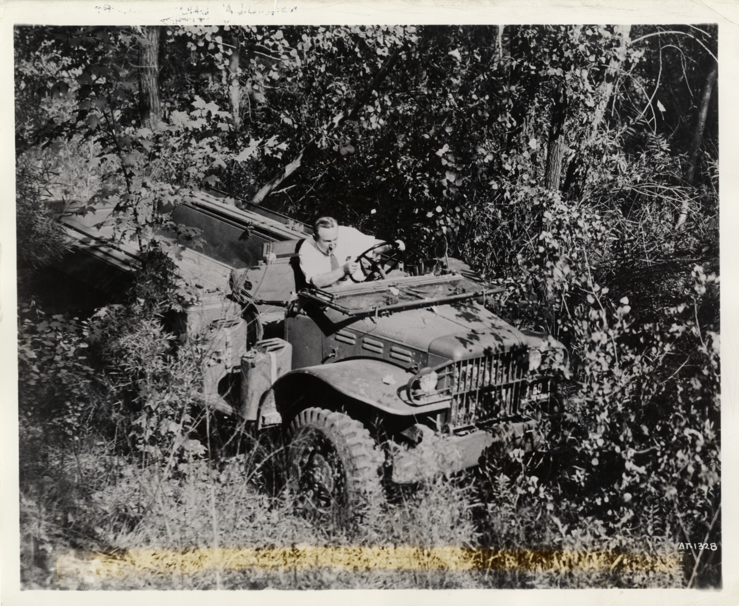 View of man driving a Dodge Army truck through the woods at Chrysler Army Truck Proving Ground. Label on back: "Low-silhouetted Dodge troop transports are sent through virgin woods as they are tested at the Chrysler Army Truck Proving Grounds. The above picture was taken while the truck was actually going through woods at a speed of between 10 and 20 miles an hour. (AT-1328)."