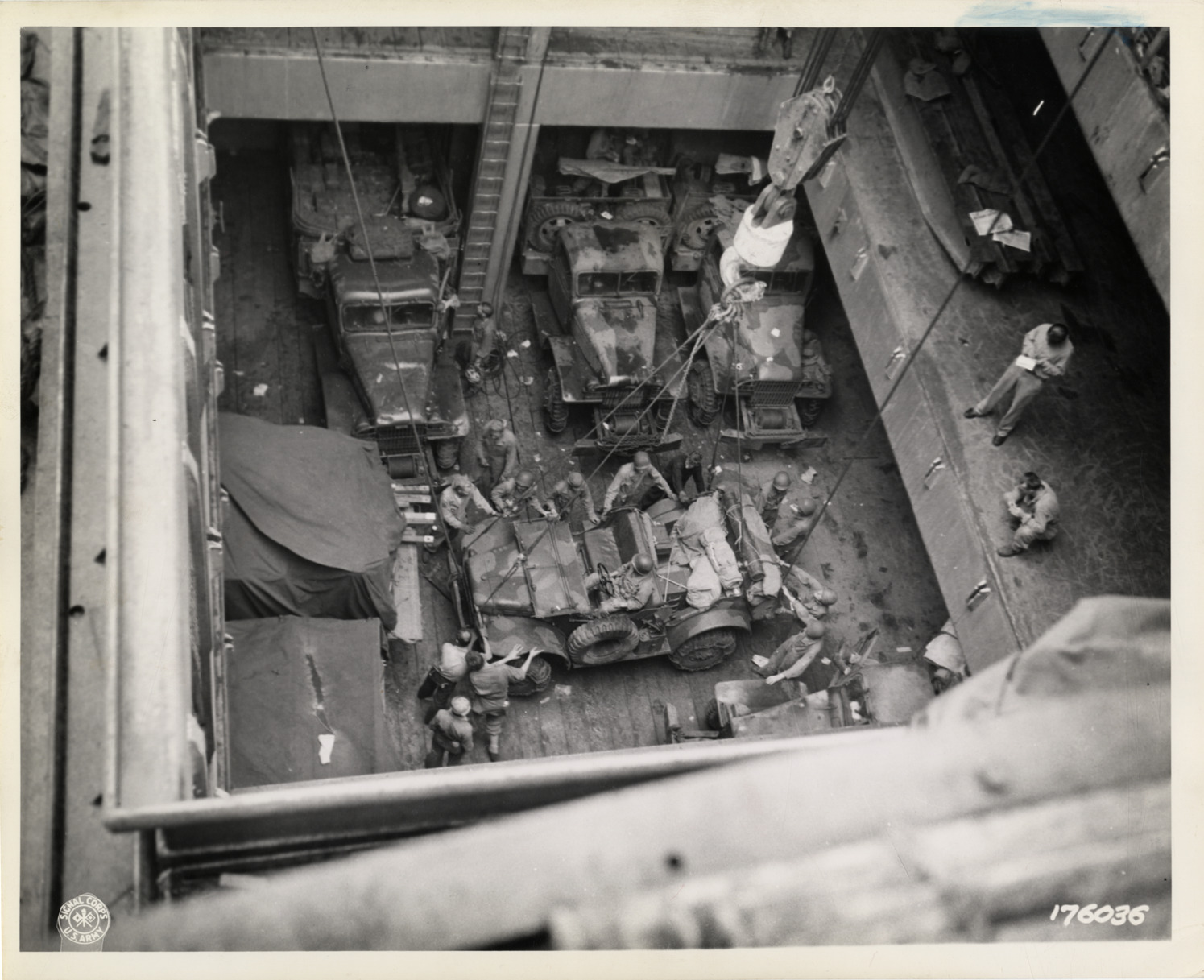 Bird's-eye view of soldiers surrounding jeeps and military trucks in the hold of a troopship. Printed on back: "SC 176036. Jeeps and 2 1/2 ton trucks in the hole [sic] of a troopship which are waiting to be unloaded for the attack of Rendova Island in the South Pacific. June 30, 1943. Stamped on back: "Signal Corps photo, please credit. [undecipherable] for publication by Bureau of Public Relations, War Department."