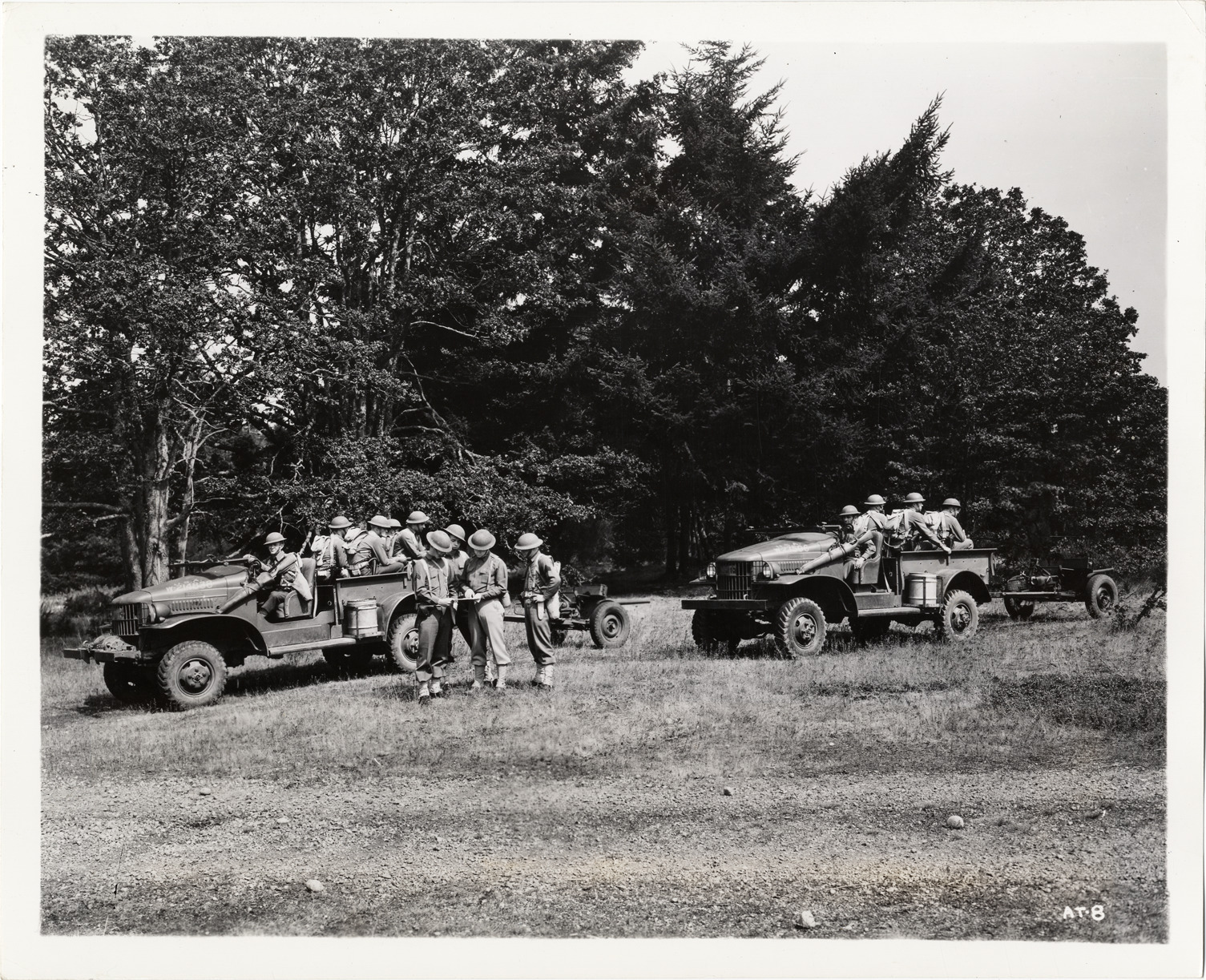 View of U.S. Army soldiers with two Dodge military trucks. Label on back: "Dodge Army trucks, troop transports, hauling 37 mm. anti-tank guns. Officers and men of an Anti-Tank Company pause for a few minutes somewhere in the U.S.A. to orient their position on the map. Photo was taken during the marking out of a 'field problem.' AT-8."