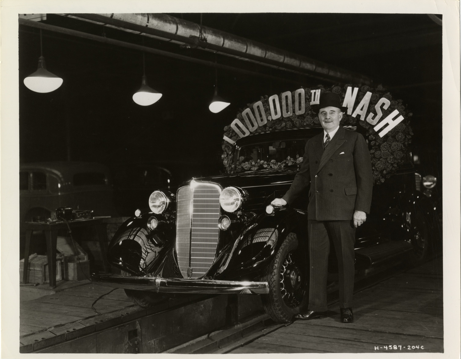 View of Charles W. Nash posing with the one millionth Nash car. Car is decorated with roses and a sign reading: "1,000,000th Nash." Handwritten on back: "C.W. Nash with millionth Nash car, 1934."