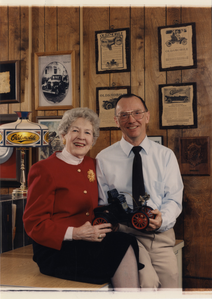 View of Helen Earley and Jim Wilkinson posing with a scale model of a 1902 Oldsmobile car. Framed Oldsmobile advertisements and "Oldsmobile" lamp in background. Stamped on back: "Leavenworth Photographics, Inc. Photographic [undecipherable] for advertising and industry. 929 West Street. Lansing, Michigan 48915." Handwritten on back: "L to R. Helen Earley, Jim Wilkinson."