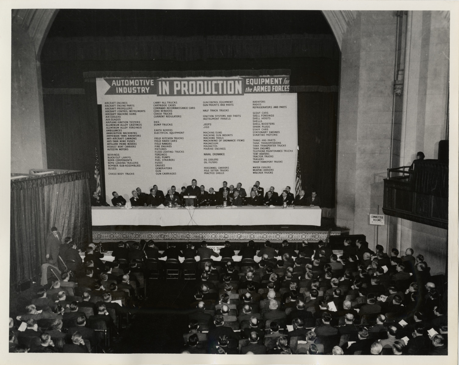 View of men, sitting at dais on small stage, during the first meeting of the American Council for War Production held at the Masonic Temple in Detroit, Michigan on January 24, 1942. Other men sit in audience. Banner behind dais reads: "Automotive industry in production, equipment for the Armed Forces [list of vehicles and parts]." Handwritten on back: "ACWP, 1942, first meeting."