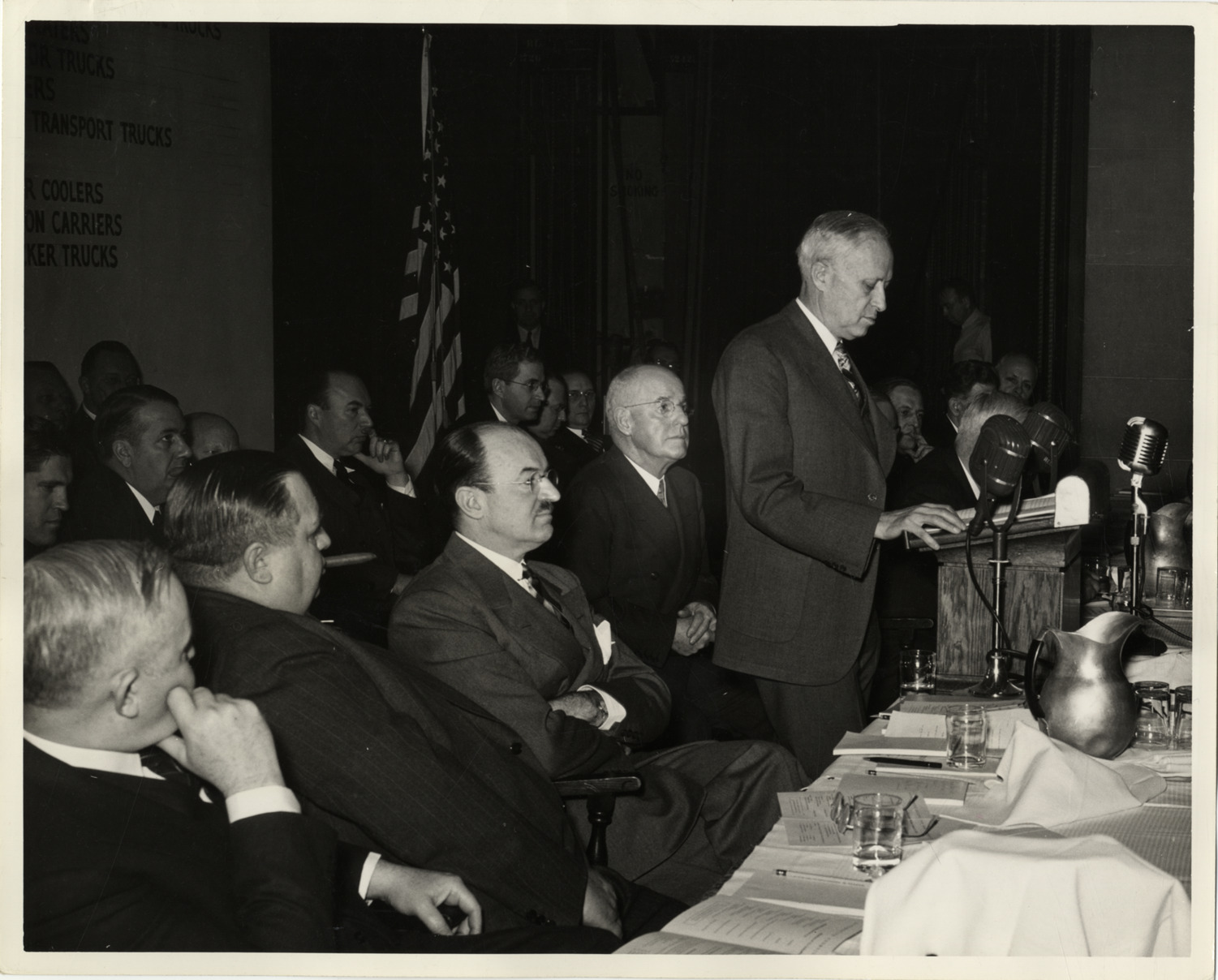 View of man standing at podium and John Warner, Ernest Kanzler, Alvan Macauley and others, sitting at table during the first meeting of the American Council for War Production held at the Masonic Temple in Detroit, Michigan on January 24, 1942. Label on back: "First meeting of Automotive Council for War Production, held at Masonic Temple, January 24, 1942." Handwritten on back: "ACWP, 1942, first meeting."