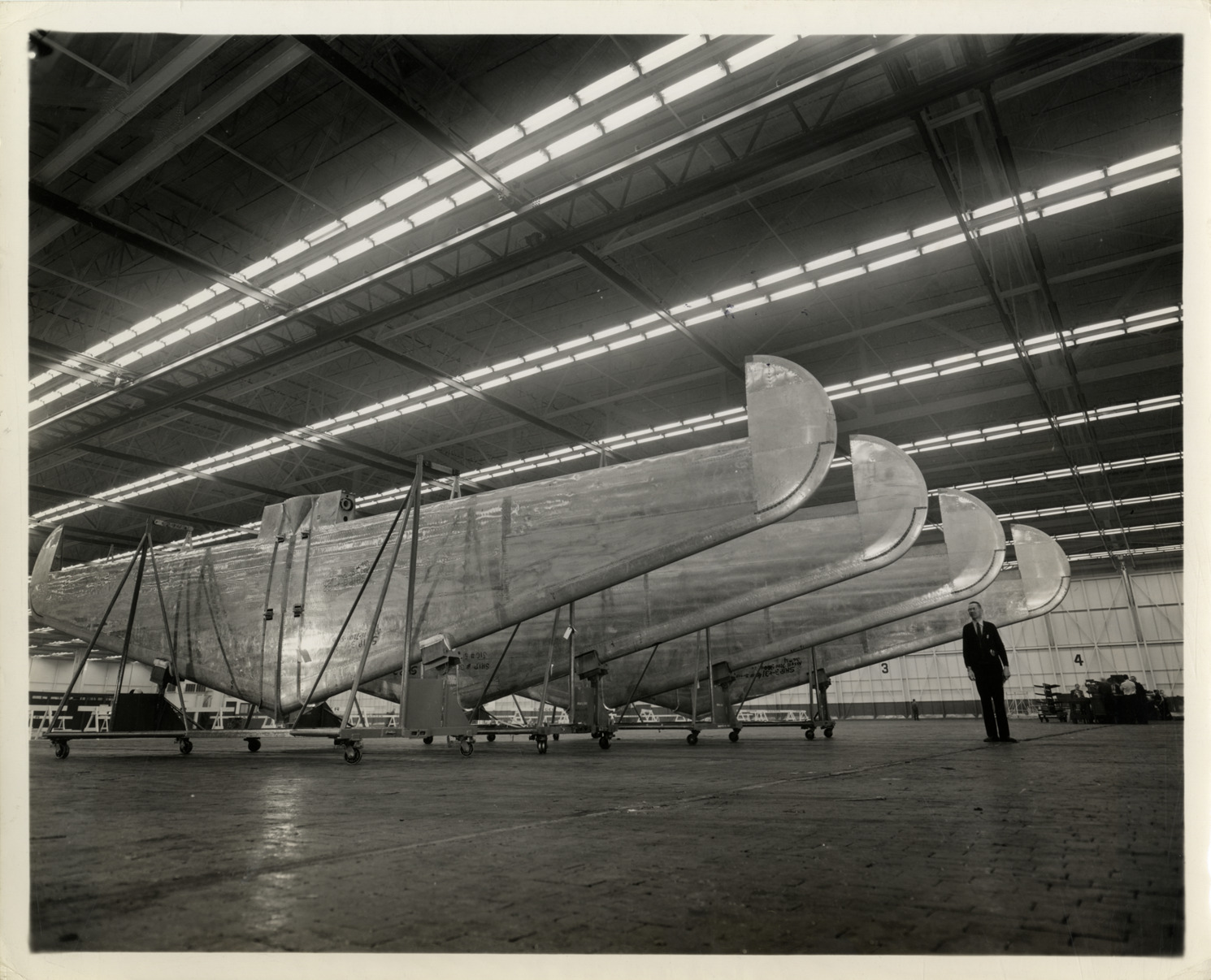 View of a man posing with completed stabilizers for the B-29 Superfortress bomber aircraft at the Fisher Body, Cleveland Aircraft Plant No. 2. Label on back: "Completed stabilizers for the Army Air Forces new Superfortress, the B-29, are shown above in a section of Fisher Body's Cleveland Aircraft Plant No. 2. Fisher has reached volume output of B-29 parts and assemblies. From W.S. McLean, Fisher Body Division, General Motors Corporation, Detroit, Michigan. (Note editor: This caption and photo has been reviewed by the War Department)." Handwritten on back: "Aircraft--Bombers (Parts & assembly)."