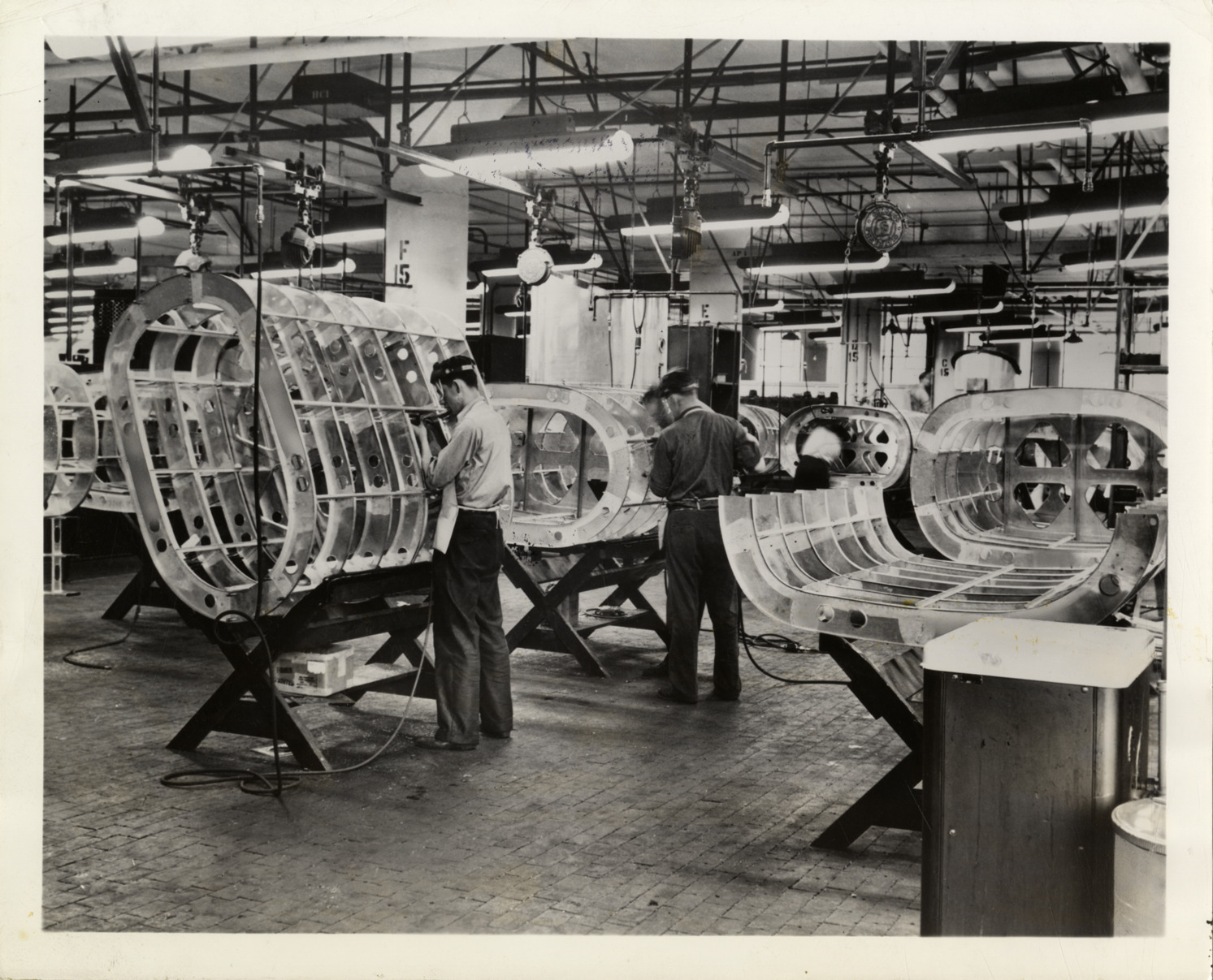 View of workers constructing auxiliary fuel tanks for bomber aircraft at the Fisher Body plant. Label on back: "(Editor's note: this picture has been approved by the U.S. Army Air Corps). Auxiliary fuel tanks such as those pictures in construction above will give valuable assistance to the Army in ferrying bombers over long distances. These fuel tanks, being built in large quantities by Fisher Body, augment the normal fuel supply and give bombers a greater range. From: W.S. McLean, Fisher Body Division, 8-106 General Motors Bldg., Detroit, Michigan. For immediate release." Handwritten on back: "Aircraft--Bombers (Parts & assembly)."