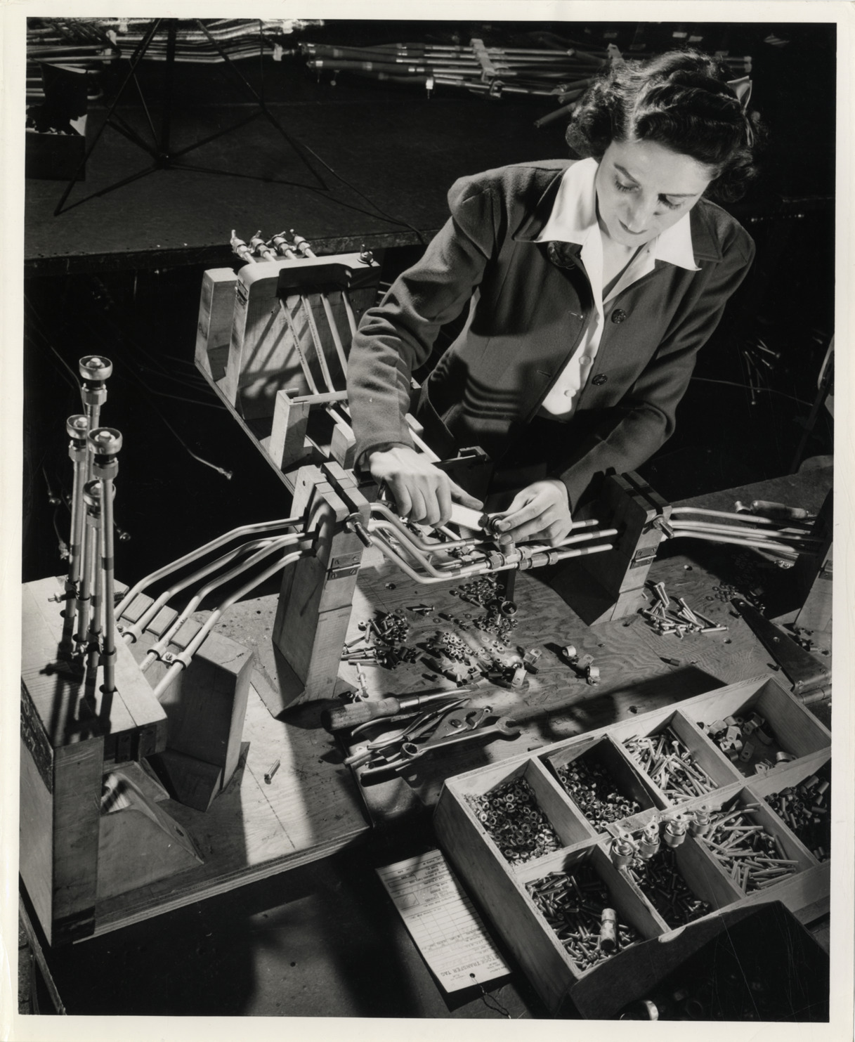 Woman worker assembling tubes for aircraft, Ford Motor Company, Willow Run Plant
