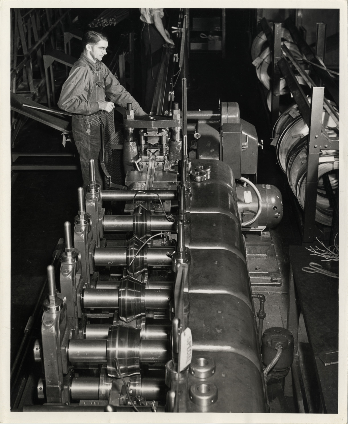 View of worker shaping aluminum strips into channel beams and ribs for the B-24 Liberator bomber at the Ford Motor Company Willow Run Plant. Handwritten on back: "Ford. Former shapes aluminum strips into channel beams and ribs for Liberator bomber. Aircraft--Bombers (Parts & assembly)."