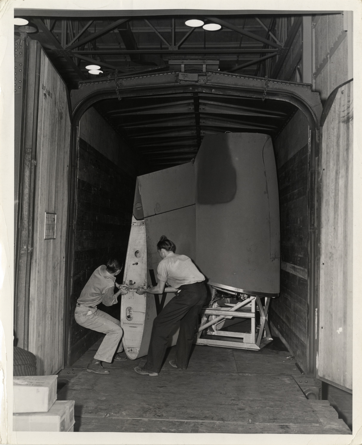 Workers unloading bomber wing section built by Murray Body at the Douglas Aircraft Company